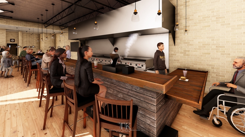 The commercial portion of The Spot at JC is planned to include 13 individual businesses, with a mix of uses designed to support community activity and economic growth. Planned amenities include restaurant options such as a supper club and coffee shop, a banquet hall for events, a gymnasium, and additional commercial spaces.